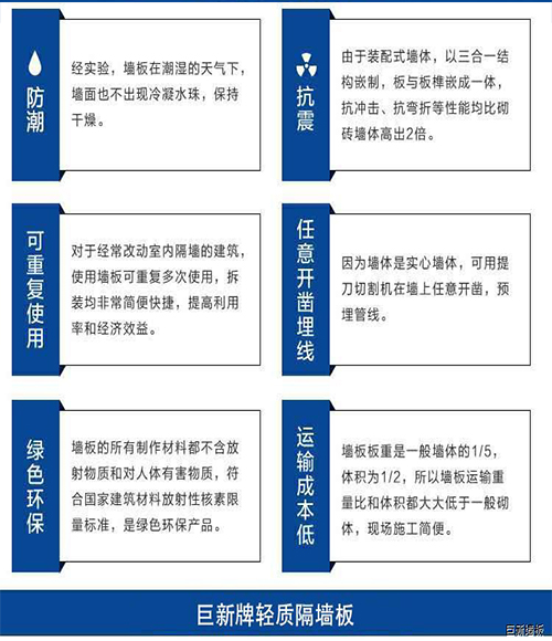 巨新輕質墻板是《國標GB/T23451-2009》建筑用輕質隔墻條板的簡稱,是指采用輕質材料或輕型構
